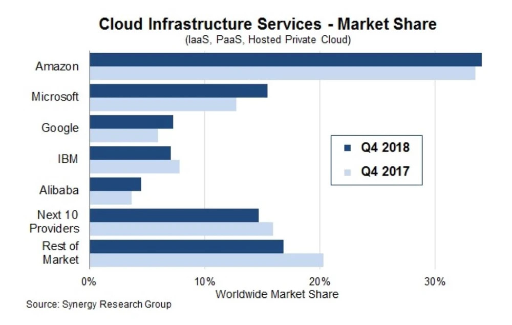 Amazon kann dabei weiter an Marktanteilen gewinnen und bleibt größer als die nachfolgenden vier Cloud-Konkurrenten zusammen. Der First-Mover-Vorteil von Amazon Web Services macht sich hier deutlich bemerkbar. Doch Microsoft und Google wachsen deutlich schneller als der Gesamtmarkt und können den Vorsprung von Amazon etwas verringern.