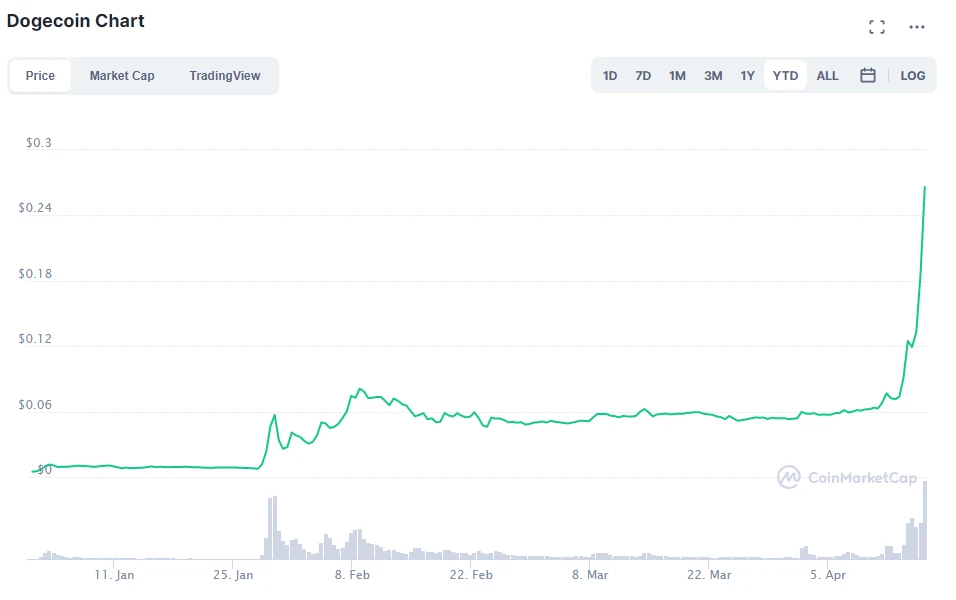 Der Kurswahnsinn bei Dogecoin geht weiter: Die Kryptowährung schießt am Freitagvormittag um rund 105 Prozent auf 0,27 Dollar nach oben. In der Nacht hatte er bei 0,29 Dollar ein neues Allzeithoch markiert, doch auch das könnte schon bald wieder Makulatur sein.