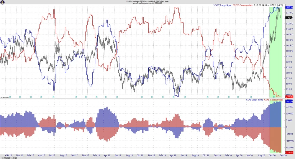 Die Commitments-of-Traders Daten sprechen hingegen eine sehr deutliche Sprache. Die Sojabohnen Produzenten vergrösseren ihre Short-Positionen von Woche zu Woche und sind mitlerweile mit -279.571 Kontrakten so short wie noch nie seit Beginn der Aufzeichnungen in den achtziger Jahren.