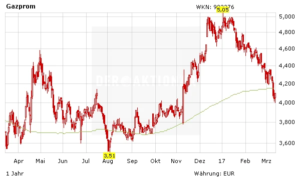Im heutigen Handel kann sich die Aktie zwar wieder etwas erholen. Dennoch ist das Chartbild der Gazprom-Titel weiterhin deutlich angeschlagen. Nicht investierte Anleger sollten daher zunächst noch weiter an der Seitenlinie verharren. Wer die Papiere bereits besitzt, beachtet den Stoppkurs bei 3,50 Euro.