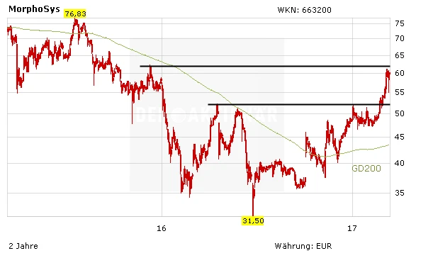 Die Aktie von Morphosys bleibt eine der interessantesten deutschen Biotech-Werte. Zumal im laufenden Jahr einige interessante News von Produktseite anstehen. Das Hauptaugenmerk dürfte hierbei sicherlich auf der Zulassungsentscheidung für Guselkumab liegen, die Ende dieses Jahres erfolgen könnte. Aber auch bei einigen firmeneigenen Programmen stehen Studiendaten zur Veröffentlichung an. Zudem könnte Morphosys mit weiteren News überraschen wie zuletzt bei der Roche-Meldung. Der Schweizer Partner plant ein neues Phase-3-Zulassungsstudienprogramm mit Gantenerumab bei Patienten mit prodromaler bis milder Alzheimererkrankung zu starten. Aus charttechnischer Sicht gilt es nun, die nächste Hürde im Bereich von 62 Euro zu nehmen.