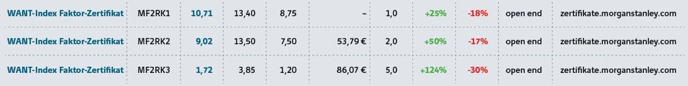 Hinweis auf potenzielle Interessenkonflikte gemäß §34b WpHG: Herr Bernd Förtsch, Verleger und Eigentümer der Börsenmedien AG, hält mittelbar eine wesentliche Beteiligung an der FinTech Group AG, zu der auch der Onlinebroker flatex und die biw Bank für Investments und Wertpapiere AG gehören. flatex und biw profitieren über die Kooperation mit Morgan Stanley vom Anlageerfolg der Zertifikate.