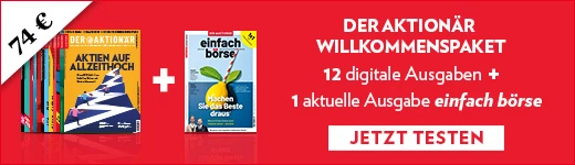 Als AKTIONÄR-Abonnent erhalten Sie neben den wöchentlich erscheinenden Magazinen auch kostenfreien Zugriff auf den Plus-Bereich. Sollten Sie noch kein Abonnent sein, lohnt es sich, jetzt mit dem Willkommenspaket zu starten: 12 Ausgaben DER AKTIONÄR plus eine aktuelle Ausgabe einfach börse zum Vorteilspreis von 74 statt 98,60 Euro. Sie sparen über 20 Prozent.