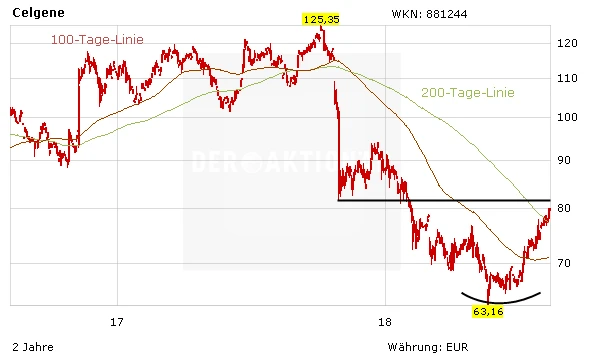 In den letzten Wochen hat die Börse die Pipeline-Erfolge, die Celgene verbucht hat, zum Teil eingepreist. Auf Euro-Basis hat das Papier die 200-Tage-Linie nach oben durchbrochen, auf US-Dollar-Basis hingegen steht die Celgene-Aktie kurz vor dem Kaufsignal. Für den AKTIONÄR bleibt Celgene auf dem aktuellen Kursniveau ein Kauf. Begleitet von einem positiven Newsflow sollte die Aktie in der Heimatwährung bis zum Jahresende wieder in dreistellige Kursregionen vorstoßen.
