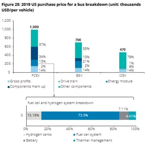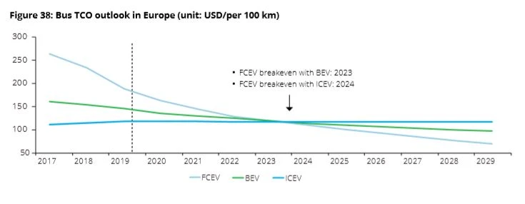 Der Hammer: Demnach werden etwa die Gesamtkosten (TCO) eines Wasserstoff-Buses schon 2024 die von einem Verbrenner schlagen. Bereits 2023 würde die Brennstoffzelle wirtschaftlicher als ein Batterie-Bus sein. Für kleinere Elektroautos vergeht noch mehr Zeit bis zum Kosten-Break-even. Doch bei kleineren Liefervans sagte DHL-Streetscooter schon 2019 dem AKTIONÄR: "Was die die TCO (Total Cost of Ownership) betrifft, werden diese beim neuen Fahrzeug vergleichbar mit einem Diesel-Fahrzeug sein."