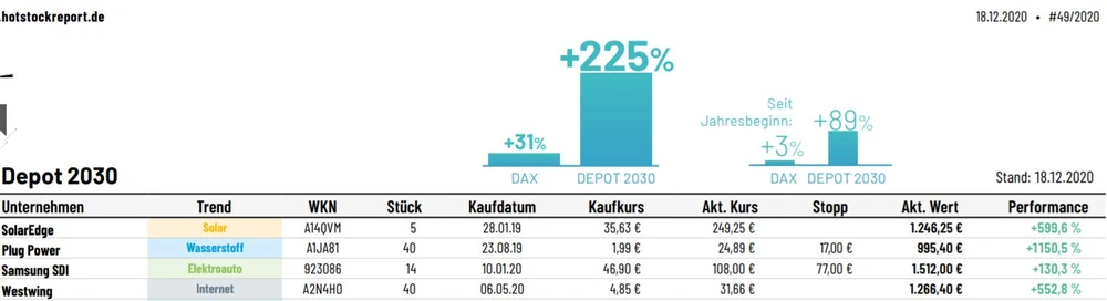 Wir hatten unseren Lesern in der Ausgabe 40/2020 zu Gewinnmitnahmen geraten und dazu, lieber auf etablierte Player wie Plug Power zu setzen (siehe neues AKTIONÄR TV). Auch nach einem Plus von 1.200 Prozent im Depot 2030 halten wir an Plug Power fest.