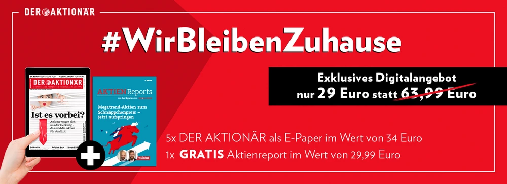 Bestellen Sie jetzt das exklusive #WirBleibenZuhause-Paket von DER AKTIONÄR für nur 29 Euro (statt regulär 63,99 Euro), erfahren Sie Woche für Woche wie Sie jetzt den Grundstein für ein langfristig erfolgreiches Depot legen und lesen Sie den AKTIONÄR bequem und sicher als digitale E-Paper-Ausgabe. Bestellen Sie noch heute und lesen Sie die neueste Ausgabe bereits an diesem Mittwoch ab 22 Uhr.