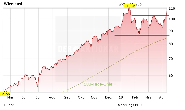 Das Chart-Bild der Wirecard Aktie hat sich dadurch deutlich aufgehellt. Gefolgt von einem weiter anhaltenden positiven Newsflow könnte sich die Wirecard Aktie weiter in Richtung Allzeithoch bewegen. Dieses befindet sich bei 111,50 Euro. Für investierte Anleger gilt: Dabeibleiben!