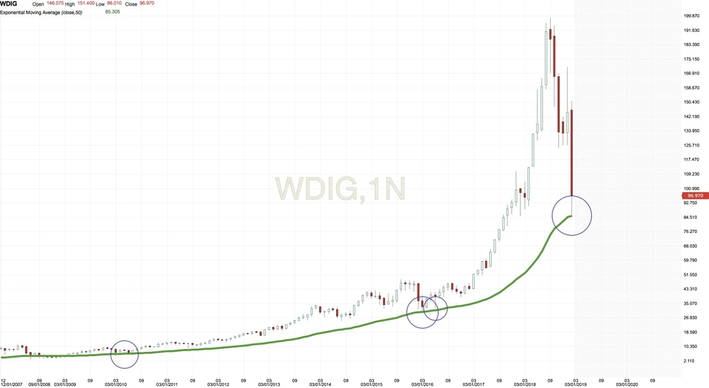 Betrachtet man den Chart der Wirecard-Aktie auf Monatsbasis, erkennt man zum einen sofort den steilen Aufwärtstrend, der sich seit 2017 etabliert hat (und den Titel schließlich in den DAX katapultierte). Man erkennt zudem, dass es immer wieder größere Korrekturen gegeben hat. Spannend wird es, wenn man einen gleitenden Durchschnitt erstellt (Basis: 50 Monate). Dann wird deutlich, dass die Aktie diesen seit 2010 nicht unterschritten hat. Unabhängig davon, wie hart die Korrektur auch ausfiel (und es gab bekanntlich einige auf dem Weg nach oben).