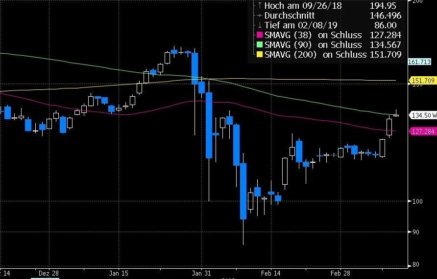 Wie geht es weiter? In dieser Woche steht bei Wirecard möglicherweise eine Richtungsentscheidung an. Die Marktteilnehmer warten gespannt auf die bevorstehende Aufklärung des angeblichen Bilanz-Skandals in Singapur – und bringen sich für eine Erholungsrallye in Stellung. Gelingt der Sprung über die charttechnischen Hürden, könnte sich die Gegenbewegung in Erwartung der Neuigkeiten noch einmal beschleunigen. Das nächste charttechnische Ziel wartet dann bei 151,70 Euro.