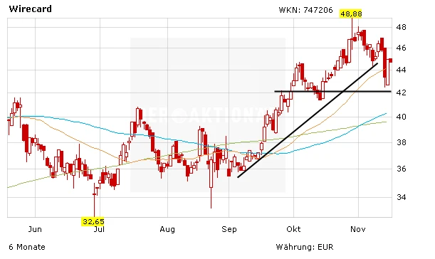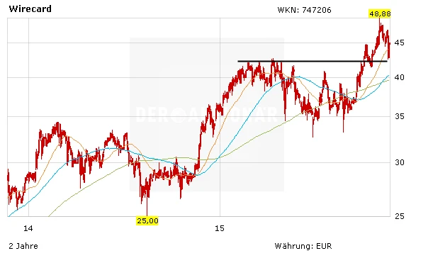 Es bleibt dabei: DER AKTIONÄR sieht für die Wirecard-Aktie Potenzial. Der Rücksetzer endete exakt am horizontalen Widerstand. Die Übernahme der Great Indian Retail Group vor wenigen Wochen sollte nicht die letzte gewesen sein. Der gute Newsflow sollte in den nächsten Monaten anhalten. Nachkaufchance, nächstes Etappenziel 50 Euro.
