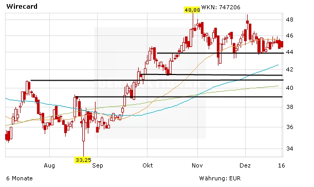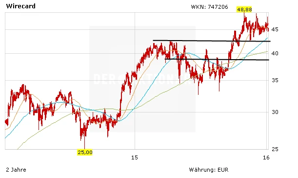 Nachdem Wirecard am Mittwoch von Morgan Stanley hochgestuft wurde, kletterte das Papier in die Nähe des bisherigen Allzeithochs bei 48,95 Euro. Im Anschluss konnte sich das Papier den schwachen Gesamtmarkt allerdings nicht entziehen. Morgan Stanley hält ein Kursziel von 55,00 Euro für möglich. Der Markt unterschätze das langfristige strukturelle Wachstum des Zahlungsabwicklers, so Analyst Andrew Humphrey. Wirecard habe dafür das richtige Geschäftsmodell. Neben vielen Analysten sieht DER AKTIONÄR Wirecard ebenfalls gut im Rennen. Der Zahlungsabwickler rechnet im kommenden Jahr mit einer deutlichen Gewinnsteigerung.