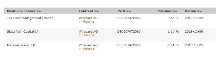 Bereits zum 6. Dezember hatte auch der US-Hedgefonds Slate Path Capital sein Short-Engagement auf 1,1 Prozent weiter ausgebaut. Die Finanzinstitute wetten damit auf weitere Verluste der Wirecard-Aktie.
