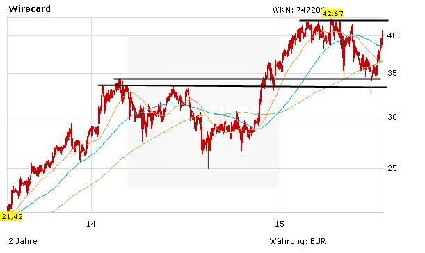 Es bleibt dabei: Wirecard wird vom Trend hin zu bargeldlosem Zahlen profitieren. Das Chartbild hat sich deutlich aufgehellt. Die Aktie bleibt ein Kauf. Nächstes Etappenziel ist das alte Hoch bei 42,67 Euro.