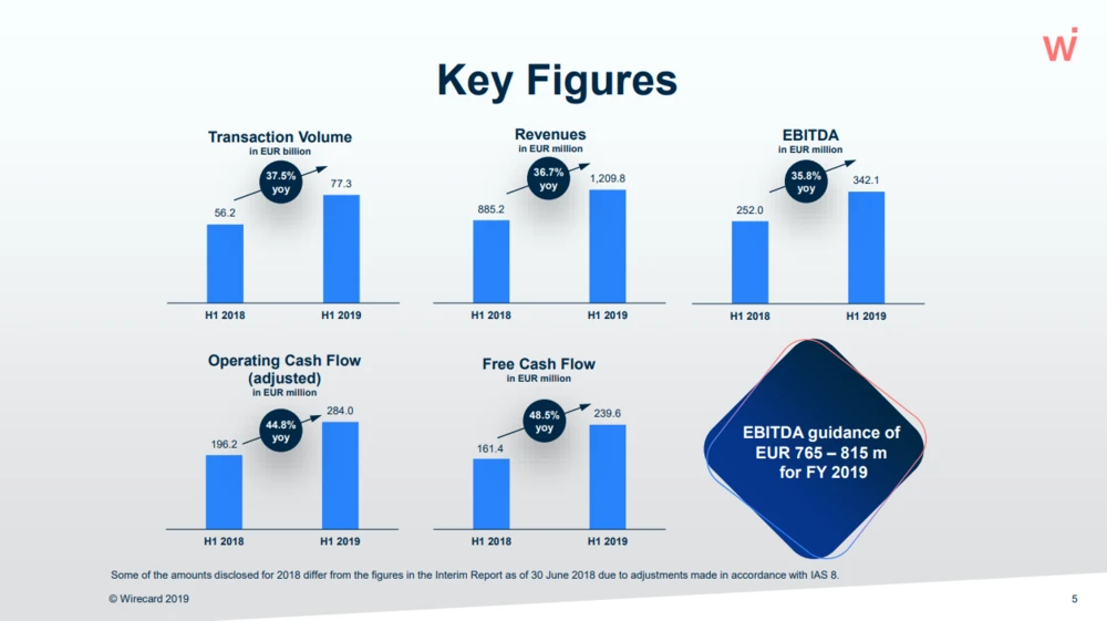 Wie der Zahlungsabwickler am Morgen mitteilte, ist der Konzernumsatz im ersten Halbjahr um 37,5 Prozent auf 1,21 Milliarden Euro gestiegen. Auch das über die Wirecard-Plattform abgewickelte Transaktionsvolumen erhöhte sich im ersten Halbjahr 2019 um 37,5 Prozent auf 77,3 Milliarden Euro. Beim operativen Ergebnis (EBITDA) steht ein Plus von 35,8 Prozent auf 342,1 Millionen Euro zu Buche.