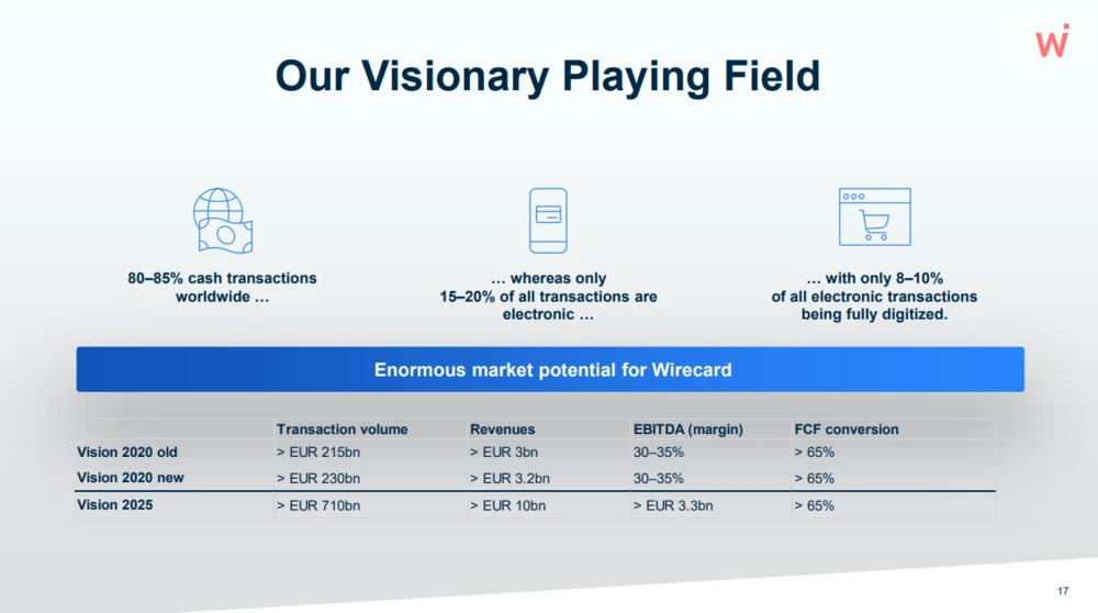 In Zahlen: Für das laufende Geschäftsjahr erwartet Wirecard nun ein EBITDA im Bereich von 765 bis 815 Millionen Euro (bisher: 760 bis 810 Millionen Euro). Im Rahmen der „Vision 2020“ genannten Mittelfristplanung erwartet der Zahlungsspezialist nun ein Transaktionsvolumen von mehr als 230 Milliarden Euro und Umsatzerlöse von mehr als 3,2 Milliarden Euro, bei einem unveränderten Korridor der EBITDA Marge und einer unveränderten FCF-Konversion.