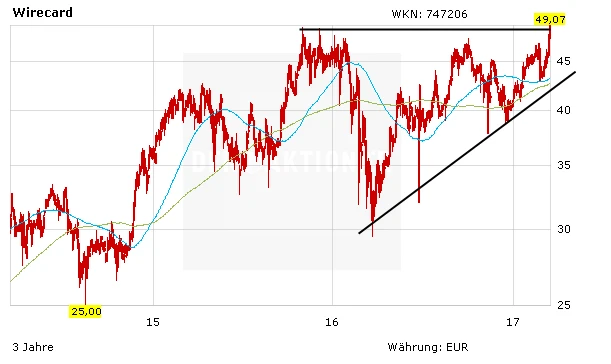 Unterstützt vom positiven Newsflow der letzten Tage hat die Wirecard-Aktie den Sprung auf ein neues Allzeithoch geschafft. In der Spitze ist der Kurs am Dienstag bis auf 49,23 Euro gestiegen und kämpft am Nachmittag um die 49-Euro-Marke.