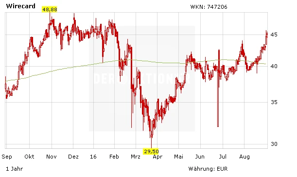 Die Wirecard-Aktie ist am Mittwoch auf den höchsten Stand seit Anfang Februar geklettert und damit auf Kurs zu ihrem Allzeithoch bei 48,78 Euro. Zwar steigt damit auch das Rückschlagsrisiko. Anleger, die der Trading-Empfehlung des AKTIONÄR gefolgt sind, bleiben aber vorerst dabei.