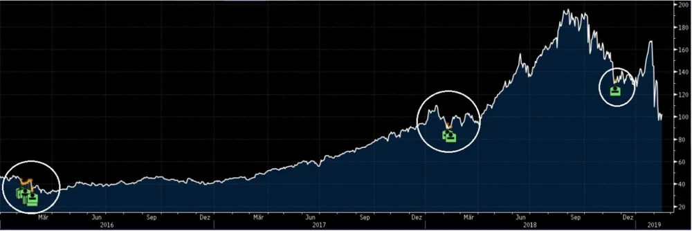 Nach dem SIRF-Report im Januar 2018 das gleiche Spiel: Die Aktie sackt ab, der CEO kauft zu. 50.000 Aktien im Volumen von rund 1,23 Millionen Euro waren es damals. Zuletzt hat der Vorstandschef im November 2018 rund 8.000 Wirecard-Aktien im Wert von 1,32 Millionen Euro gekauft. Damals gab es zwar weder Negativ-Schlagzeilen, noch eine Short-Attacke. Der Kurs war aber im schwachen Marktumfeld für Tech-Werte innerhalb weniger Monate um bis zu 35 Prozent zurückgekommen.