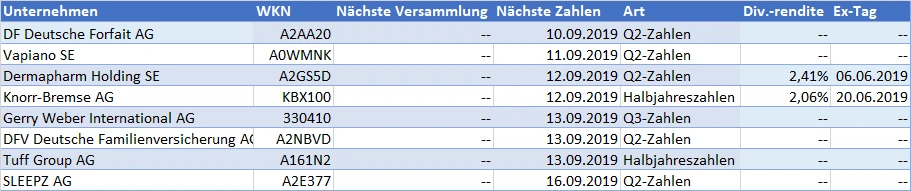 Die Berichtssaison erreicht in diesen Wochen ihr Tief, einige Small Caps dürften dennoch für Spannung sorgen: Allen voran die operativ stark in die roten Zahlen gerutschte Vapiano wird ein Update zum Q2 geben. Da das KUV nur mehr bei 0,35 liegt, hat die gemeldete Ertragsentwicklung Hebel-Potential (in beide Richtungen) auf den Aktienkurs. Der insolvente Modeverkäufer Gerry Weber bringt am Freitag Q3-Zahlen heraus. Hauptversammlungen und Dividendenstichtage gibt es in dieser Woche keine.