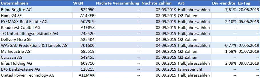 Die Berichtssaison der deutschen Blue Chips ist nahezu abgeschlossen. Delivery Hero meldet am Mittwoch Q2-Ergebnisse. In der zweiten Reihe stehen auch in dieser Woche allerdings noch einige Zahlentermine an. Hauptversammlungen und Dividendenstichtage gibt es in dieser Woche keine.