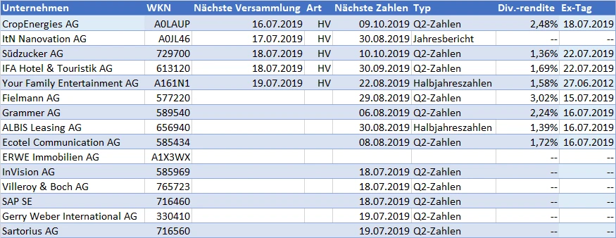 Die Dividendensaison läuft aus, die Quartalssaison an. Bei einigen Unternehmen kommt es in dieser Woche nochmal zu hohen Ausschüttungen an die Aktionäre: Allen voran Fielmann zahlt heute drei Prozent. Die ersten Unternehmen berichten Halbjahreszahlen, darunter SAP am Mittwoch. Hauptversammlungen bei Südzucker (Mittwoch) und einigen Unternehmen aus der zweiten Reihe runden die Wochentermine ab. Alle Infos sind in der Tabelle zusammengefasst: