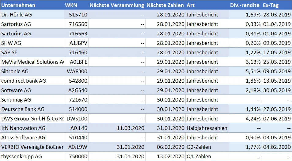 Die Berichtssaison läuft an: In dieser Woche melden 13 Unternehmen aus dem CDAX vorläufige oder endgültige Zahlen zum abgelaufenen Quartal oder Gesamtjahr. Besonders gespannt dürften Anleger auf die vorläufigen Zahlen von SAP (morgen) und der Deutschen Bank (Donnerstag) warten. ThyssenKrupp lädt am Freitag zur Hauptversammlung ein. Alle Termine sind in der folgenden Tabelle zusammengefasst: