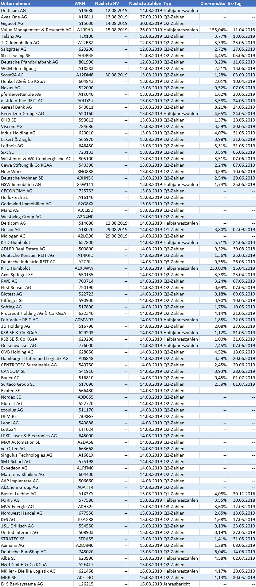 Die Berichtssaison läuft weiter auf Hochtouren: In dieser Woche gewähren 85 Unternehmen einen Blick in ihre Bücher. Heute sind das unter anderem Salzgitter, Sixt und TLG Immobilien. Vier Nebenwerte laden zur Hauptversammlung ein. Dividendentermine liegen in dieser Woche nicht vor.