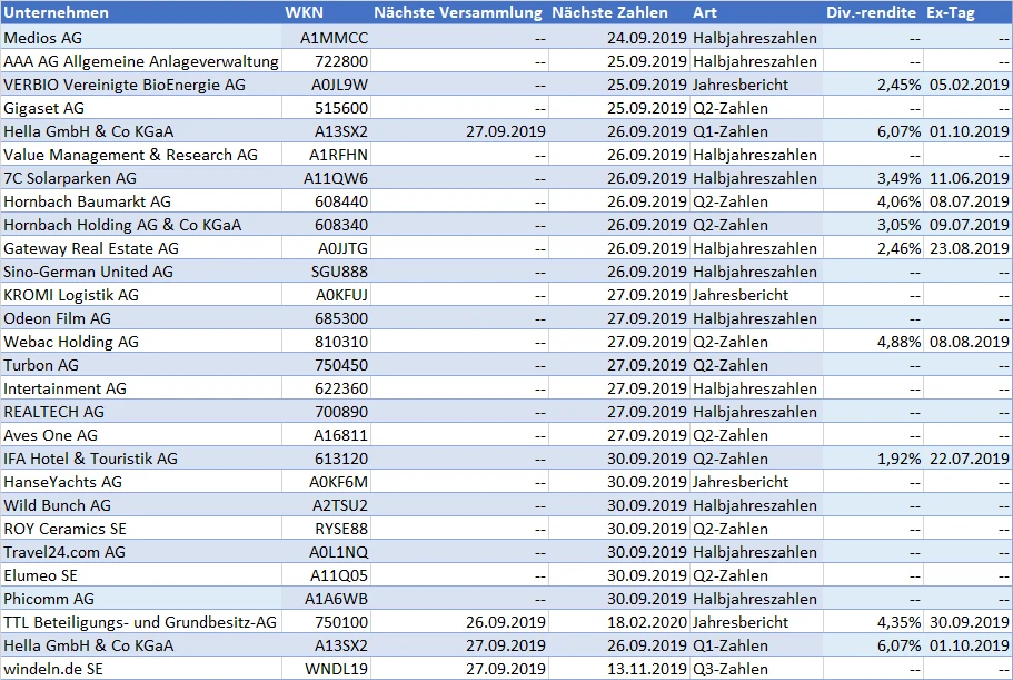Zum Quartalsende legen diverse Small Caps ihre Bücher offen: Insgesamt 25 deutsche Unternehmen berichten über das vergangene Quartal oder Halbjahr. Die finanziell angeschlagene windeln.de lädt zur außerordentlichen Hauptversammlung. TTL und Hella dürften nach der ordentlichen Hauptversammlung hohe Dividendenauszahlungen bringen.