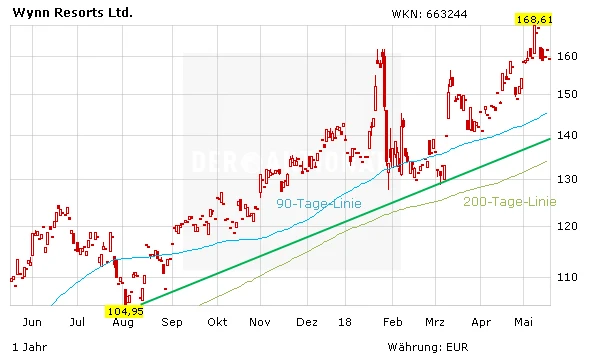 Die Aktien der Casinobetreiber sprangen deutlich an – unter ihnen auch das Papier von Wynn Resorts. Der US-Konzern besitzt in der chinesischen Spielermetropole drei Casino-Hotels und ist damit einer der großen Profiteure des neuen Aufschwungs in Macau. Insgesamt verfügt Wynn Resorts über fünf Casinos – ein sechstes Hotel wird aktuell in der Nähe von Boston, Massachusetts gebaut und soll 2019 eröffnen.