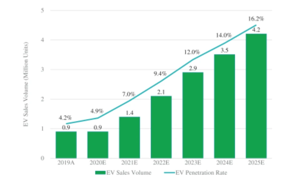Hinzu kommt die Fantasie, ein Stück weit vom Elektroauto-Boom zu profitieren. Xiaomi bietet nicht nur selbst E-Scooter und E-Karts an: Seit 2019 ist Xiaomi an dem gerade an die Börse gehenden E-Auto-Bauer Xpeng beteiligt. Der Wert von XPeng hat sich von „über drei Milliarden Dollar“ auf nun angepeilte rund zehn Milliarden Dollar vervielfacht. Wie viel Prozent Xiaomi genau an XPeng hält, legt das neue SEC-Prospekt nicht offen. Doch hier wird unterstrichen. „Xiaomi ist einer unserer strategischen Investoren und wir entwickeln gemeinsam digitale Fahrzeug-Schlüssel.“ Xiaomi glaubt, dass sich diese Partnerschaft „vertieft“ und man Innovationen für smarte Hardware und IoT-Anwendungen vorantreibt. Wie spannend der China-E-Auto-Markt für Player wie Tesla, Nio aber auch XPeng ist, zeigt folgende Grafik. IHS zufolge wird sich der Absatz von Elektroautos von 2019 bis 2025 von 0,9 auf 4,2 Millionen vervielfachen.