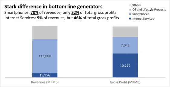 Denn die Margen sind bei Xiaomi extrem niedrig. 2018 konnte das Unternehmen lediglich eine Bruttomarge von 12,7 Prozent erwirtschaften. Die Konkurrenz glänzt hierbei mit Werten von teils deutlich über 30 Prozent. Auch wenn das Hardwaregeschäft für 70 Prozent des Umsatzes verantwortlich ist, steuert es lediglich 32 Prozent der Gewinne bei. Die Sparte „Internet Services“ hingegen glänzt mit deutlich besseren Margen und bei einem Anteil von neun Prozent am Umsatz 46 Prozent vom Gewinn aus. Kein Wunder, dass sich Xiaomi lieber als Internetunternehmen statt als Hardwareanbieter bezeichnet.