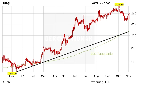 Die Karriere-Plattform Xing wächst weiter kräftig: Dank neuer Produkte und einer höheren Mitgliederzahl klettern Umsatz und EBITDA in den ersten drei Quartalen um 22 beziehungsweise 24 Prozent. Damit dürfte die im TecDAX gelistete Xing-Aktie neuen Schwung erhalten und wieder Kurs in Richtung Rekordhoch bei 275,15 Euro nehmen.