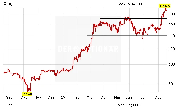 Die Kursentwicklung der Xing-Aktie kann sich sehen lassen! Der Titel eilt derzeit vom Allzeithoch zum nächsten. Wenn es nach den Analysten der Berenberg Bank geht, wird Xing in den nächsten Jahren die Investitionen noch stärker ankurbeln. Am Dienstag hatten die Experten ihr Kursziel für Xing von 160 auf 181 Euro erhöht. Ihre Einstufung lautet weiterhin „Halten“.