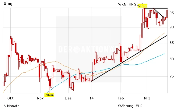 Die Xing-Aktie ist im Peer-Group-Vergleich attraktiv bewertet. So wird der weltweit größte Betreiber einer Business-Plattform, LinkedIn, mit einem 2014er-KGV von 124 bewertet. Das Xing-KGV liegt gerade einmal bei 33. Anleger, die der Long-Empfehlung des AKTIONÄR gefolgt sind, bleiben investiert. Gelingt der Ausbruch über das alte Bewegungshoch bei 96,84 Euro – und danach sieht es aufgrund der starken Performance am Montag aus - sollte sich der Aufwärtstrend fortsetzen.