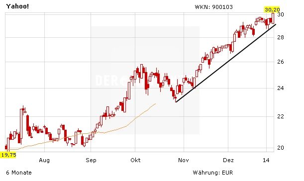 Die Aktie befindet sich indes in einem schönen Aufwärtstrend. Ende 2013 hatte Yahoo Impulse durch ein Milliarden-Aktienrückkaufprogramm erhalten. Kurzfristig glänzt das Papier mit einem weiteren Kaufsignal im Chart. Im gestrigen US-Handel wurde eine starke weiße Kerze ausgebildet, welche für zunächst weiter steigende Kurse spricht. Trader greifen zu!
