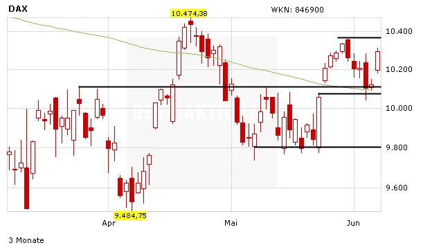 DER AKTIONÄR hat am Montag im Rahmen des DAX-Check bei DER AKTIONÄR TV ein Long-Produkt empfohlen (DG0LTL; Kurs: 10,45 Euro), mit dem Trader darauf setzen können, dass die 200-Tage-Linie hält und der DAX wieder Anlauf auf die jüngsten Bewegungshochs nimmt. Der Stoppkurs sollte bei umgerechnet 10.030 Punkten platziert werden.