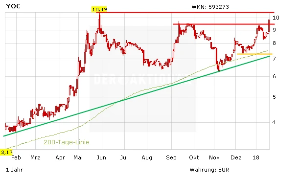 Die positiven Geschäftsaussichten hat die YOC-Aktie bereits vereinnahmt. Seit Früjahr 2017 versucht der Wert das Niveau bei gut 10 Euro nachhaltig zu überwinden, scheiterte aber mehrmals bei etwa 9,50 Euro. Heute Mittag sprang der YOC-Kurs um fast zwölf Prozent auf 9,84 Euro. Sollte die neue Plattform sich wie erwartet positiv auf das Geschäft auswirken, lautet das längerfristige Ziel 20 Euro. Optimisten können sich ein paar Stücke ins Depot legen. Nach unten sollte die Aufwärtstrendlinie (derzeit bei 7,20 Euro) nicht unterschritten werden.