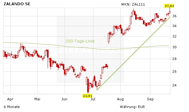 Die Aktien des Online-Modehändlers markierten am Donnerstag ein neues Allzeithoch bei 37,85 Euro. Auch am Freitag sieht es so aus, als ob die Papiere die Rallye der vergangenen Tage fortsetzen werden. Die Chancen stehen gut, dass Anleger heute erneut ein Allzeithoch sehen werden. Wer überproportional vom Gewinn der Zalando-Aktien profitieren möchte, findet in der neuen Ausgabe 39/16 von DER AKTIONÄR ein passendes Produkt.