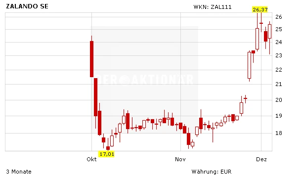Die Kursdelle Anfang der Woche bei Zalando, nachdem der schnelle Aufstieg in den MDAX gescheitert war, ist schon wieder ausgemerzt. Am Mittwoch legte das Papier mehr als fünf Prozent auf 25,39 Euro zu und befindet sich damit nur noch knapp unter dem vor Kurzem bei 26,37 Euro markierten Allzeithoch. Unterstützung erhielt das Papier dabei auch von der erwarteten Aufnahme in den SDAX aber auch von der Hoffnung einer Aufnahme in den MDAX bei den nächsten Index-Überprüfungen.