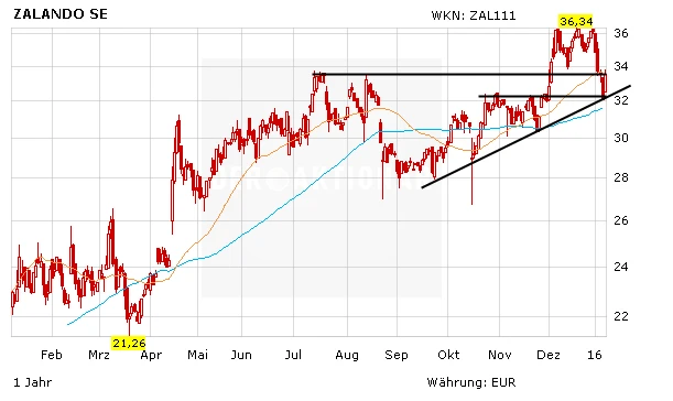 Im Zuge der allgemeinen Börsenturbulenzen hatte die Zalando-Aktie in der abgelaufenen Handelswoche sowohl die Unterstützung im Bereich von 33,80 Euro, als auch die 38-Tage-Linie nach unten durchbrochen. Die Unterstützung bei 32,30 Euro hat aber gehalten – beinahe punktgenau auf dieser Unterstützungslinie ist der Kurs am Freitag wieder nach oben gedreht.