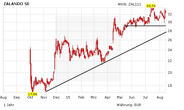 Zalando ist voll im Trend. Der Konzern hat erneut die Umsatzprognose angehoben. Obwohl höhere Kosten auf den Gewinn drücken, ist die Stimmung an der Börse entsprechend positiv. Die starken Resultate haben die Sorgen über eine Unterbrechung der angestrebten Margensteigerung verdrängt, so Analyst Christian Schwenkenbecher von Hauck & Aufhäuser. Der Experte hob seine Schätzungen an und erhöhte das Kursziel von 41 auf 43 Euro hoch. Die Einstufung lautet weiterhin „Buy“. Auf dem aktuellen Niveau entspricht dies einem Potenzial von über 33 Prozent.