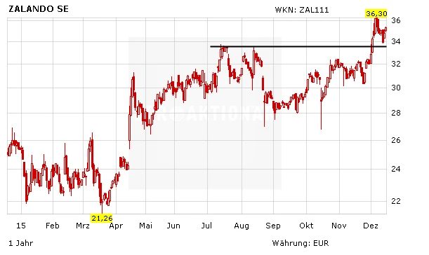 Die Aktie des E-Commerce-Riesen war in der Vorwoche bei 36,25 Euro auf ein neues Allzeithoch geklettert und pendelt seitdem knapp darunter um die 35-Euro-Marke. Gestützt von der jüngsten Kaufempfehlung und dem freundlichen Gesamtmarkt tendiert die Zalando-Aktie am Dienstag wieder deutlich nach oben.