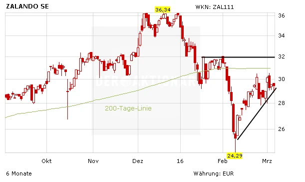 DER AKTIONÄR hält die Zalando-Aktie langsam wieder für aussichtsreich. Das Unternehmen ist für die Zukunft gut positioniert. Anleger steigen ein, sobald die 200-Tage-Linie nach oben durchbrochen wird. Die Signallinie verläuft bei 30,97 Euro.