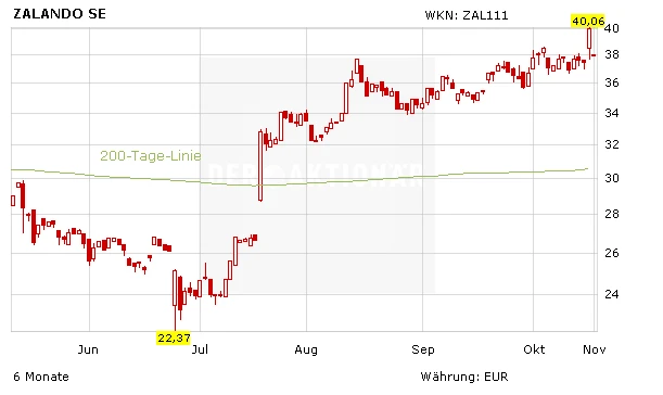 Die Papiere von Zalando haben einen wilden Ritt hinter sich. Vom Allzeithoch bei 41,11 Euro Mitte Oktober korrigierte die Aktie zehn Prozent. Nach dem rasanten Anstieg der vergangenen Monate allerdings eine völlig normale Reaktion des Marktes. Der kurzzeitige zwei-Prozent-Rutsch von Mittwoch war der US-Präsidentschaftswahl und dem Trump-Sieg geschuldet. Anleger, die ein gutes Timing hatten, konnten gestern satte zehn Prozent Gewinn machen.