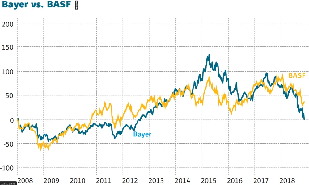So kommt der Chemieriese aktuell auf einen Marktkapitalisierung von 64,5 Milliarden Euro. Der gesamte Bayer-Konzern ist hingegen nur noch 59,8 Milliarden Euro wert. Zum Vergleich: Ende 2014 überstieg der Börsenwert des Leverkusener Pharmariesen erstmals die magische Marke von 100 Milliarden Euro. Der Kurs kletterte im Hoch bis auf 146,45 Euro. Seit der riskanten Übernahme des US-Saatgutgiganten Monsanto für 66 Milliarden Dollar beziehungsweise im Zuge des ersten Angebots ging es aber kontinuierlich bergab.