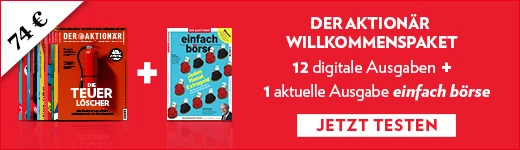 Das Willkommenspaket von DER AKTIONÄR macht Ihnen den Einstieg leicht: Mit 12 digitalen Ausgaben zum Vorteilspreis von 74 statt 98,60 Euro sparen Sie über 20 Prozent. Zusätzlich erhalten Sie eine aktuelle Ausgabe einfach börse mit Tipps rund um die moderne Geldanlage.