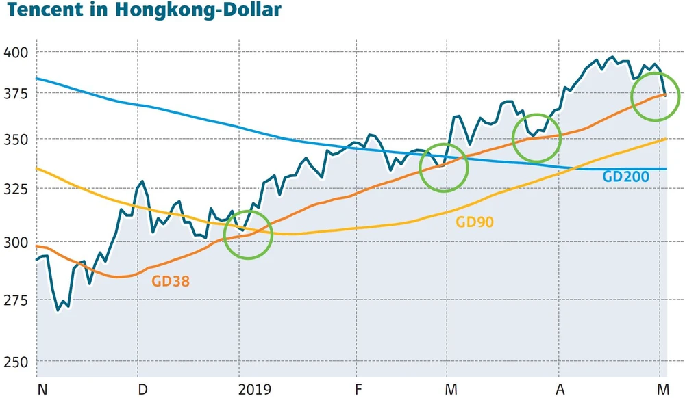 DER AKTIONÄR sieht jedoch keinen Handlungsbedarf für Anleger von Tencent. Rein charttechnisch gesehen, wäre der Rücksetzer auf den gleitenden Durchschnitt sogar als Kaufchance zu werten. Bereits mehrere Male setzte der Chart im aktuellen Aufwärtstrend auf die 38-Tage-Linie zurück.