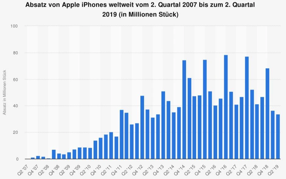 Der Konzern sorgt vor, während die Einnahmen beim iPhone zurückgehen. Das Telefon ist zwar nach wie vor das wichtigste Apple-Produkt, sein Anteil am Geschäft sinkt aber. Waren es einst rund zwei Drittel, macht der Umsatz mit Smartphones jetzt nur noch etwa 50 Prozent aus. Nach Berechnungen der Marktforschungsfirma Canalys verkaufte Apple im vergangenen Quartal 36 Millionen iPhones und damit 13 Prozent weniger als ein Jahr zuvor.