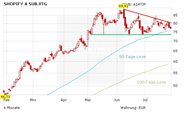 Charttechnisch ist Shopify wegen des abfallenden Dreiecks im langfristigen Aufwärtstrend interessant. Tendenziell ein eher negatives Chartsignal, wirkt das Verlassen des Dreiecks nach oben stark trendbestätigend.